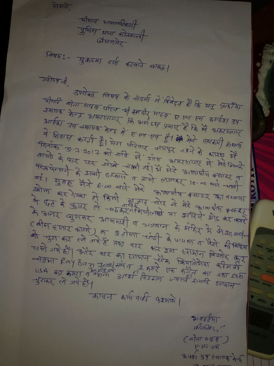 और  अंदर भगवान के मंदिर में से 20000 नगदी  व 8 तोला चांदी की चेन व पैरो की बिछिया ,मोबाइल चार्ज ,2 कैमरे आदि कीमती सामान चुरा ले गये ! लेकिन एक मोबाइल टेबल  पर ही छोड़ गए !   बीना यादव का कहना है कि वो रात्रि में 11:30 उपस्वास्थ्य केंद्र से अपने मिलने वालों के यहां  चली गयी  !  जब सुबहे 6 बजे उपस्वास्थ्य केंद्र वपस आई तो देखा कि सारा सामान बिखरा पड़ा था !  हालाँकि एक मोबाईल कमरे में ही टेबल पर पड़ा था बिलकुल सामने ही पर छुआ तक नहीं !