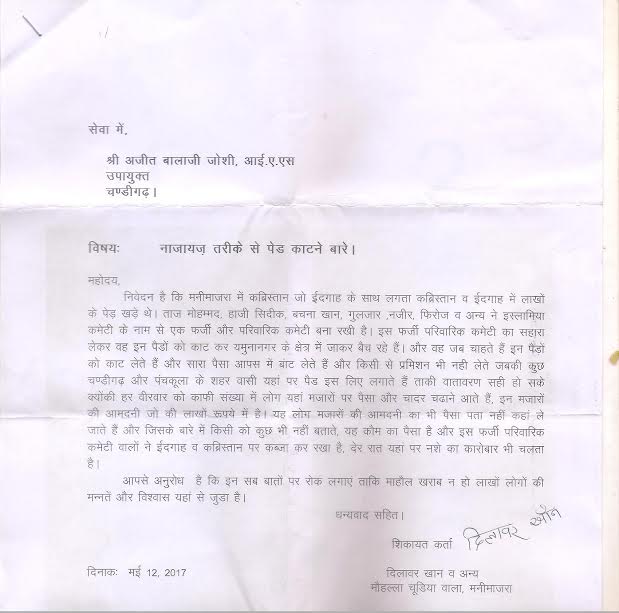 चण्डीगढ़ ; 25 मई ; अल्फ़ा न्यूज इंडिया डेस्क ;—– मनीमाजरा हाउसिंग बोर्ड चौक से कुछ दूर स्थित कब्रिस्तान व ईदगाह में कई पेड़ों को नाजायज ढंग से काट दिये जाने का आरोप लगा है। शिकायकर्ता मनीमाजरा के मोहल्ला चूडिय़ावाला निवासी दिलावर खान व अन्यों ने इस बाबत चण्डीगढ़ के उपायुक्त अजीत बालाजी जोशी, चंडीगढ़ वन विभाग के निदेशक संतोष कुमार, मनीमाजरा के कब्रिस्तान व ईदगाह में लगे पेड़ों को नाजायज ढंग से काटकर बेचने की शिकायत की अधिकारियों से दिलावर खान का आरोप है कि यहां के प्रबंधकों ने इस्लामिया कमेटी के नाम से एक फर्जी और पारिवारिक कमेटी बना रखी है। इस कमेटी के लोग अवैध रूप से कीमती पेड़ों को काटकर यमुनानगर के आसपास स्थित क्षेत्र में बेच रहे हैं और पैसा आपस में बांट लेते हैं। शिकायतकर्ता का कहना है कि यहां चण्डीगढ़ और पंचकूला के काफी लोग माथा टेकने आते हैं व पर्यावरण सही रहे इसके लिए पौधारोपण भी करके जाते हैं। इस कारण यहां काफी संख्या में कीमती पेड़ उग आए थे परंतु इन लोगों इन्हें एक-एक करके साफ करना शुरू कर दिया। इसके अलावा हर वीरवार को भी काफी संख्या में यहां लोग मजारों पर पैसा और चादर चढ़ाने आते हैं। इस सारी आमदनी, जो लाखों रुपयों में है, को भी खुर्द-बुर्द कर दिया जाता है और किसी को कोई हिसाब नहीं दिया जाता है। दिलावर खान का कहना है कि इस फर्जी पारिवारिक कमेटी के लोगों ने इस ईदगाह व कब्रिस्तान पर जबरन कब्जा कर रखा है व कुछ सरकारी जमीन भी हथियाई हुई है। उन्होंने इस सभी की कड़ाई से जांच किये जाने की मांग उठाई है।