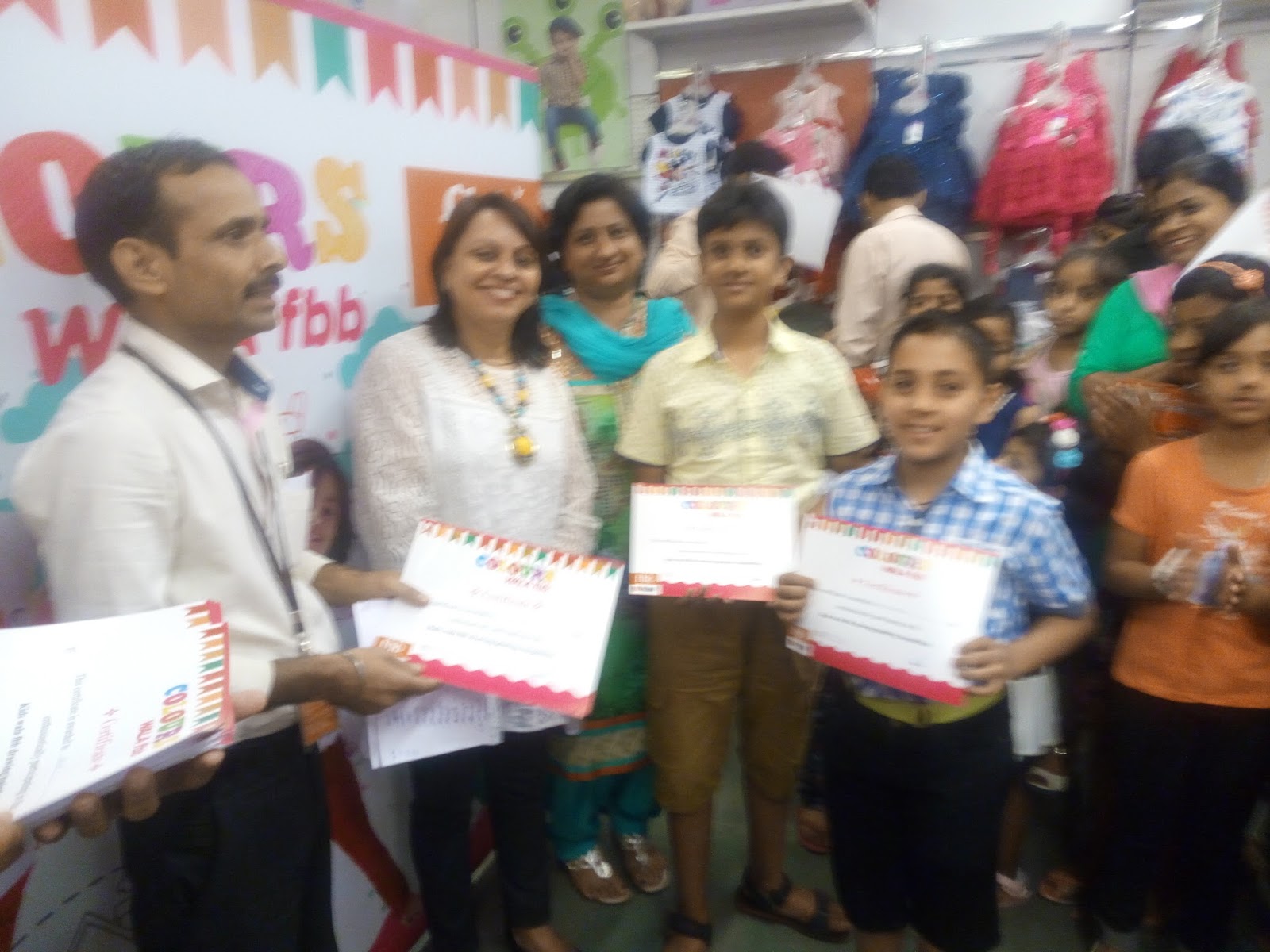 आज श्रृंखला को आगे बढ़ाते हुए ये ड्राइंग कम्पीटिशन का मेगा आयोजन रविवार को बिगबाजार के बड़े शानदार सभागारों में आयोजित किया जायेगा ! आयु वर्ग [जूनियर] 2 से 7 वर्ष में 38 बच्चों ने और आयु वर्ग [सीनियर ] 8 से 14 वर्ष के तकरीबन 32 बच्चों ने भाग लिया ! यहाँ बच्चों ने ग्लोबल वार्मिंग और संयुक्त परिवारों के साथ मदर्स डे से संबंधित विषयों में बखूबी रंग भरे ! और दोनों वर्गों के पहले तीन तीन विजेताओं को प्रशस्ति पत्र देकर प्रोत्साहित किया गया ! बच्चों के लिए जलपान की सराहनीय व्यवस्था से बच्चे गदगद हो उठे ! जीरकपुर स्थित बिग बाजार में चार बजे सांय आयोजित ड्राइंग कम्पीटिशन में दोनों वर्गों में 40 से ज्यादा बच्चों ने भाग लिया ! बच्चों ने आज मदर्स डे को मद्देनजर रखते हुए अपनी कलर्स विद एफबीबी की थीम ही जैसे मातृ दिवस को समर्पित कर दी हो ! यहाँ निर्णयाक की भूमिका में डॉ रूचि राय आहूजा और अदिति कलाकृति की प्रिंसिपल आर्टिस्ट एम् शर्मा आभा ने निभाते हुए बड़ी दूरदर्शिता से पहले तीनों