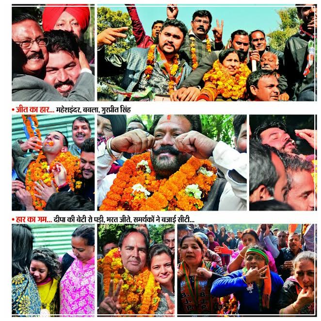 शहर भर में खबर लिखे जाने तक ढोल धमाकों को आवाजें गूंजने से माहौल खुशगवार बना हुआ है ! चाहे कोई गम में है या ख़ुशी में लाल परी दोनों जगह अपनी हाजिरी से सबका स्वागत कर रही है ! बुड़ैल से 14 नम्बर वार्ड से भाजपा के कंवलजीत सिंह राणा ने काग्रेस आई के करनवीर सिंह राणा को हराया ! इस सीट पर पिछले 15 वर्षों से कांग्रेस का कब्जा रहा था ! वार्ड 21 से भाजपा के युवा प्रधान जी एस ढिल्लों ने कांग्रेस आई के जतिंदर भाटिया को हराया ! कांग्रेस का सूपड़ा साफ करने में उम्मीदवारों से कहीं ज्यादा रोल मोदी के नोटबन्दी का रहा है ! ये भी सच रहा कि युवा समाज की मतदान के प्रति उदासीनता खुद में इक बड़ा सवाल पैदा कर रही है ! एक सीट निर्दलीय दलीप शर्मा ने वार्ड नम्बर 19 से भाजपा के राजकिशोर को 243 मतों से हराते हुए जीती है !