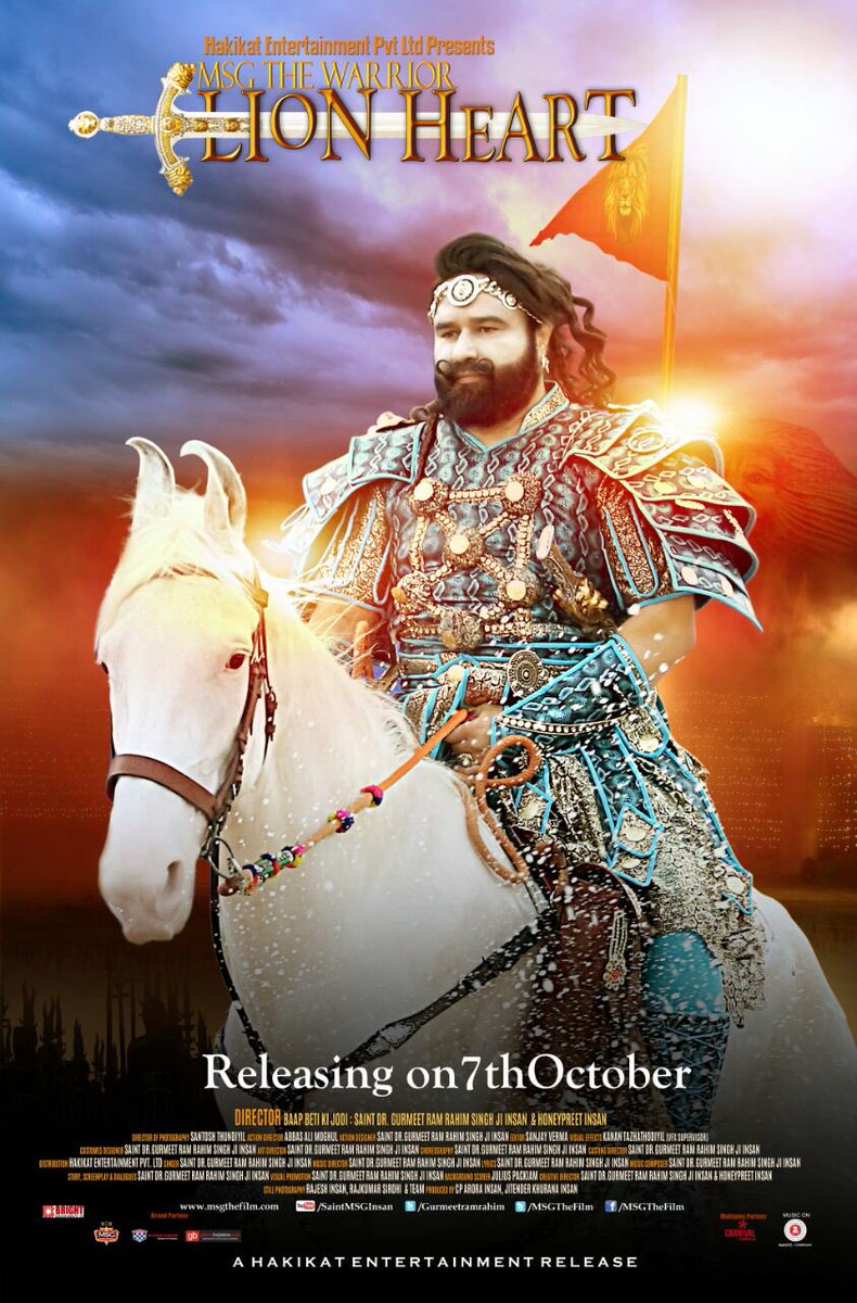 सिरसा ; 3 अक्टूबर ; सुनील इंसा ; डेरा सच्चा सौदा के सर्वेसर्वा महाराज गुरमीत राम रहीम एक नए अंदाज और स्वरूप में धर्म समाज सहित मानवता के पुजारियों को इक नई दिशा देने हेतु फ़िल्मी बड़े पर्दे पर आगामी सात अक्टूबर को नजर आएंगे !एमएसजी ;दी लायन ; वारियर को जर्मनी पत्रिका ने सर्वश्रेष्ठता की श्रेणी में आंका है ! टॉप 15 में इसके ट्रेलर को स्थान दिया है ! बीती 17 सितम्बर को मुम्बई के फाइव स्टार होटल ताज दी बिजनेस में उक्त रिलीज होने वाली फिल्म का म्यूजिक खूब बड़े स्तर पर धूमधाम से लांच किया गया था ! महाराज गुरमीत रामरहीम जी ने लीड रोल अदा किया है ! ये फिल्म समाज सहित पथ भ्रष्ट लोगों के जीवन को नईदिशा देने में भगीरथी भूमिका निभाएगी ! फिल्म वर्ल्डवाइड रिलीज होगी ! टिकट खिड़की पर रिकॉर्डतोड़ दर्शकों को खींच लाने में फिल्म कामयाब रहेगी ! बड़े बजट की बड़ी फिल्म है जिसको देखने को बारम्बार परिवार सहित बैठ कर दिल और दिमाग करेगा !