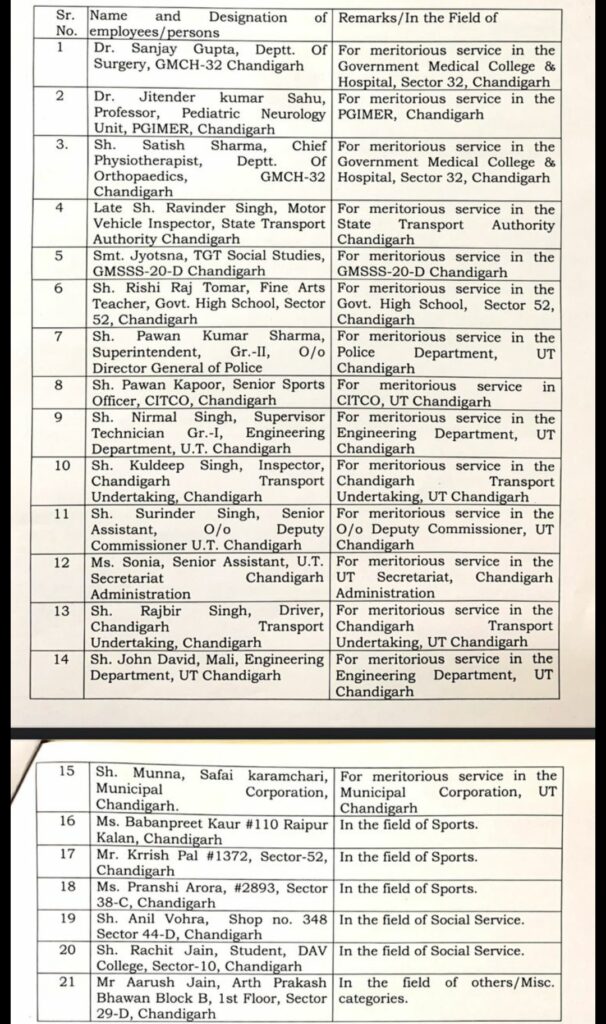 चंडीगढ़ 25 जनवरी 2025 आर विक्रम शर्मा हरीश शर्मा अनिल शारदा प्रस्तुति— हर साल की भांति वर्ष 2025 के गणतंत्र दिवस पर भी चंडीगढ़ प्रशासन के सार्वजनिक व्यक्तियों और कर्मचारियों को विशेष क्षेत्रों में उत्कृष्ट सेवाएं प्रदान करने के लिए प्रशस्ति प्रमाण पत्र देकर सम्मानित किया जाएगा। शासन की सरकारी सेवा में विशेष क्षेत्र में उत्कृष्ट सेवा प्रदान करने वालों में गवर्नमेंट प्रेस यूटी चंडीगढ़ के मूल दो कर्मचारियों ने भी प्रेस विभाग और यू टी प्रशासन का नाम रोशन किया है। आजकल चंडीगढ़ पुलिस के एडमिनिस्ट्रेशन के अथक परिश्रमी अपनी ड्यूटी को पूर्णतः समर्पित अधीक्षक (सुपरीटेंडेंट ग्रेड 2) पवन कुमार शर्मा और यू टी सचिवालय में कार्यरत बतौर सीनियर असिस्टेंट सोनिया को भी गणतंत्र दिवस के मौके पर सम्मानित किया जाएगा। अल्फा न्यूज़ इंडिया सभी सम्मानित व्यक्तियों व कर्मचारियों को प्रशस्ति प्रमाण पत्र प्राप्त करने पर हार्दिक बधाई और शुभकामनाएं देते हुए उज्जवल भविष्य की मंगल कामना करते हैं।।