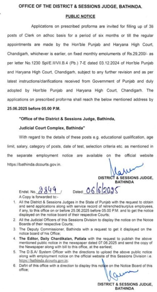 चंडीगढ़ 16/6/25 आर विक्रमा शर्मा अनिल शारदा प्रस्तुति —- पंजाब में ग्रेजुएट यानी बीए पास युवाओं के लिए सरकारी नौकरियों का पिटारा पंजाब सरकार ने खोल दिया है। 25 जून तक इच्छुक आवेदन करें। पंजाब में बीए पास युवाओं के लिए नौकरियां जारी की गई हैं। दरअसल, जिला एवं सत्र न्यायाधीश, बठिंडा ने 38 पदों के लिए आवेदन आमंत्रित किए हैं। पदों के लिए योग्य उम्मीदवार 25 जून तक फॉर्म भर सकते हैं। यह नौकरियां कोर्ट में निकली हैं।