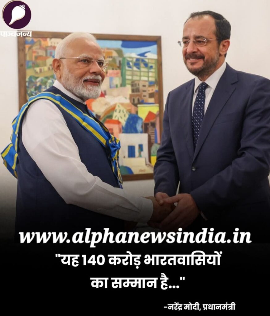 चंडीगढ़ 19.06.2025 आरके विक्रमा हरीश शर्मा अश्विनी शर्मा प्रस्तुति—–विश्व के देश साइप्रस में “ग्रैंड क्रॉस ऑफ द ऑर्डर ऑफ मकारियोस सम्मान मिलने के बाद प्रधानमंत्री नरेंद्र मोदी ने कहा कि “साइप्रस सरकार और साइप्रस के लोगों का अभिनंदन करता हूं।यह सम्मान केवल मेरा सम्मान नहीं है, ये 140 करोड़ भारतवासियों का सम्मान है, उनके सामर्थ्य और आकांक्षाओं का ये सम्मान है।ये हमारे देश के सांस्कृतिक, भाईचारे और वसुधैव कुटुम्बकम के विचारधारा का सम्मान है।”
