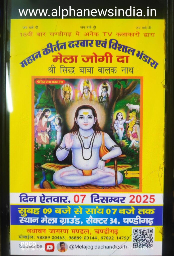 चंडीगढ़ 20 नवंबर 2025 आरके विक्रमा शर्मा करण शर्मा अनिल शारदा हरीश शर्मा अश्वनी शर्मा रक्षत शर्मा—- महान कीर्तन दरबार एवं विशाल भंडारा मेला जोगी दा हर साल की भांति इस वर्ष भी श्री सिद्ध बाबा बालक नाथ जी के असीम आशीर्वाद और अनुकंपा अनुरूप 7 दिसंबर रविवार को स्थानीय मेला ग्राउंड सेक्टर 34 में धूमधाम से आयोजित किया जाएगा।। मेला जोगी दा में वधावन जागरण मंडल चंडीगढ़ मुख्य आयोजक अपने तमाम धर्म के आस्थावानों और श्रद्धालुओं के सहयोग से संपन्न करवाएंगे। बाबा बालक नाथ जी महाराज के श्री चरणों के दास बलवीर वधावन और प्रबंधिका श्रीमती सविता वधावन और पंडित हरि कृष्ण जी अजीत बाबा जी नगला वाले सरदार बलवीर जी बाबाजी के श्री चरणों में गन गुणगान संपन्न करवाएंगे। उक्त कार्यक्रम के बारे में अधिक जानकारी देते हुए अल्फा न्यूज़ इंडिया को बताया कि मेला जोगी दा लगातार पिछले 14 सालों से मनाया जा रहा है। रविवार 7 दिसंबर को सवेरे 9:00 मेला ग्राउंड में विशाल पंडाल में बाबाजी की ज्योति सवेरे 9:00 बजे प्रचंड की जाएगी।बाद दोपहर 12:30 बाबा बालक नाथ जी का अटूट भंडारा श्रद्धालुओं में बरताया जाएगा। इसके साथ-साथ अनेकों टीवी गायक कलाकार जोगी जी के चरणों में उपस्थिति दर्ज करवाएंगे। बाबा जी की भेंटे भजन कीर्तन गाकर संगत को साथ झूमने नाचने गाने पर विवश करेंगे। भक्त बलवीर वधावन और सविता वधावन ने कलाकारों के बारे में बताया कि सुखदेव मस्ती, सतपाल सोखा, पिरती सीलो, कमल किशोर,के एस मटटू जरनैल जैली सोनिया कृष्णा भट्टी जे एस बिट्टू आरडी सागर इंदू खन्ना अंजली शर्मा लकी धीमान बाबा संजू जी और जग्गी खान सतपाल कोंडल सुषमा शर्मा जस जसविंदर रमन रोमी बलवीर मस्त मददी सुनियारा नीटा जस्सल सुषमा शर्मा मजू गोल्डी संतोषजी विजय सितारा गुरदेव दलगीर आदि 30 से भी ज्यादा गायक कलाकार बाबा जी के चरणों में हाजिरी दर्ज करवाएंगे।। मेला जोगी दा धर्म में और पुण्य कार्यों में शिरकत करने वालों का अपना मेला है। इसलिए मेले की और भंडारे की अटूट सफलता के लिए तन मन धन से सेवा करें। दान सेवा करने वाले मोबाइल नंबर 988 9004 639 और 888 90144 और 97802 147 50 और अल्फा न्यूज़ इंडिया के मुख्यालय नंबर 9872 886540 व्हाट्सएप पर 24×7 संपर्क कर सकते हैं। बाबा बालक नाथ जी बालब्रह्मचारी जी भगवान शिव पार्वती के तीसरे पुत्र के रूप में जाने जाते हैं। जो अखंड भौतिक समाज की मनोकामनाएं पूर्ण करते हैं। निरॊगता, शत्रुओं का नाश अभय दान यश कीर्ति सुख-संपत्ति और भक्ति की शक्ति व नाम का स्मरण और सिमरन काबल प्रदान करते हैं। जो लोग अनेकों प्रकार की मजबूरी धन अभाव समय अभाव के चलते बाबा जीके मोक्षदाई पावन दर्शन करने के लिए बाबा जी की गुफा जो हिमाचल प्रदेश में बड़सर में स्थित है नहीं जा सकते हैं। उनके लिए वधावन जागरण मंगल 
