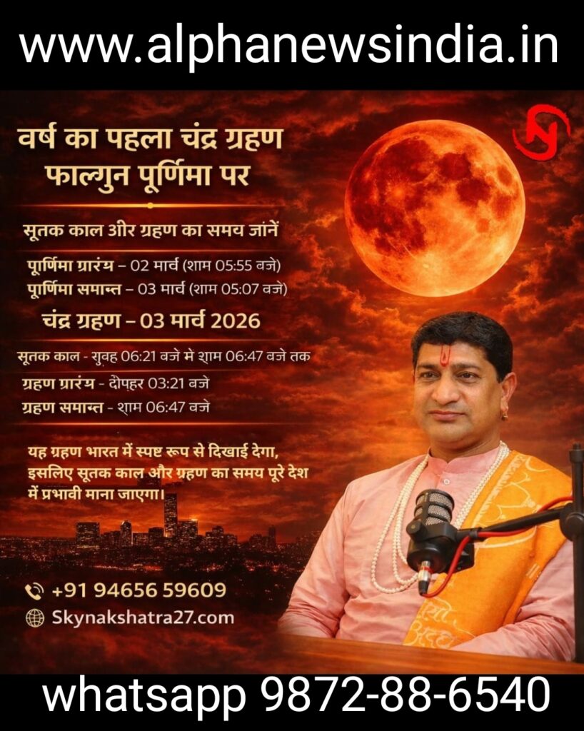 चंडीगढ़ 03 मार्च 2026 आरके विक्रमा रक्षत शर्मा अनिल शारदा प्रस्तुति — आज मंगलवार को पूर्ण चंद्र ग्रहण है। पूर्ण चंद्र ग्रहण तब घटित होता है जब पूरा चंद्रमा पृथ्वी की प्रच्छाया से आवृत हो जाता है तथा आंशिक चंद्र ग्रहण तब घटित होता है जब चंद्रमा का एक हिस्सा ही पृथ्वी की प्रच्छाया से ढक पाता है।•कब: मंगलवार, 3 मार्च, 2026•परिमाण (Magnitude): 1.155 (एक गहरा, पूर्ण ग्रहण)•कहाँ: भारत, पूर्वी एशिया, ऑस्ट्रेलिया और अमेरिका में दिखाई देगा।भारत में समय और दृश्यताभारत के अधिकांश स्थानों पर चंद्रोदय के समय इस चंद्रग्रहण का समापन दिखाई देगा, सिवाय उत्तर-पूर्वी भारत और अंडमान और निकोबार द्वीप समूह के कुछ स्थानों के, जहां ग्रहण के पूर्ण चरण का अंत भी दिखाई देगा।मुख्य समय (IST):•ग्रहण का प्रारंभ: 15:20 (दोपहर 3:20 बजे)•पूर्णता का प्रारंभ (सम्पूर्ण प्रारम्भ): 16:34 (शाम 4:34 बजे)•पूर्णता की समाप्ति (सम्पूर्ण समापन): 17:33 (शाम 5:33 बजे)•ग्रहण की समाप्ति: 18:48 (शाम 6:48 बजे)llll